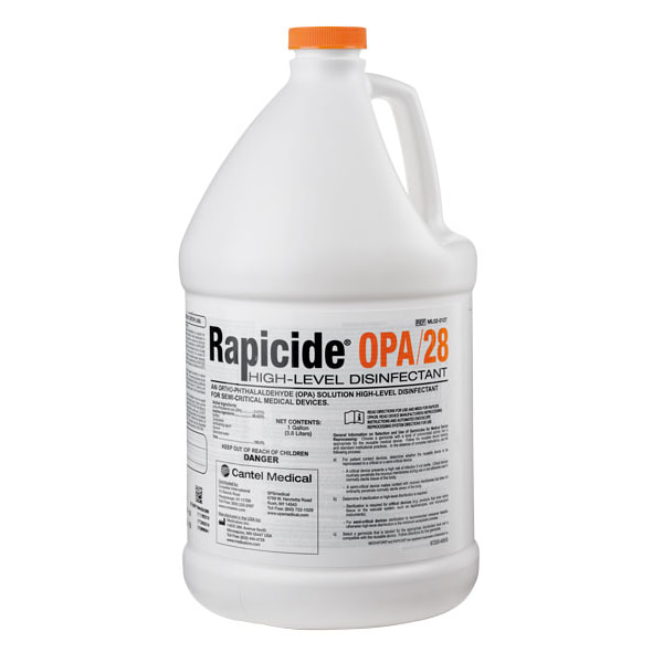 RAPICIDE OPA/28 High-Level Disinfectant is a reusable, OPA-based solution for manual or automated endoscope reprocessing of heat-sensitive, semi-critical medical devices. The disinfectant effectively inactivates Tuberculosis (TB), Methicillin-resistant Staphylococcus aureus (MRSA), Vancomycin-resistant enterococcus (VRE), and Carbapenem-resistant Enterobacterales (CRE) with a 5-minute contact time at 77°F (25°C), or 10-minute contact time at room temperature (min 68°F (20°C)). The easy-to-read RAPICIDE OPA/28 Test Strips accurately measure that minimum recommended concentration of ortho-phthalaldehyde (OPA) has been met prior to reuse, with a 3-second dip time and 90-second read time. This product is distributed by Crosstex/SPS Medical/HFG.