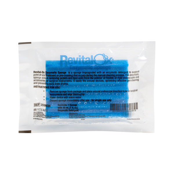 The Revital-Ox® Enzymatic Sponge is a one-time use sponge that is saturated with pre-diluted enzymatic detergent to aid in cleaning the exterior of endoscopes, accessories, and other surgical instruments. The enzymatic sponge is also available non-saturated.