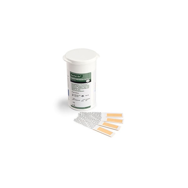 The Revital-Ox RESERT R60 Solution Test Strip is a high level disinfectant concentration monitor dedicated for use with Revital-Ox RESERT High Level Disinfectant. The purpose of the Revital-Ox RESERT R60 Solution Test Strip is to determine whether the concentration of hydrogen peroxide, the active ingredient in Revital-Ox RESERT High Level Disinfectant, is above the minimum recommended concentration (MRC) of 1.5%. The test strips are packaged in a bottle of 60 strips.